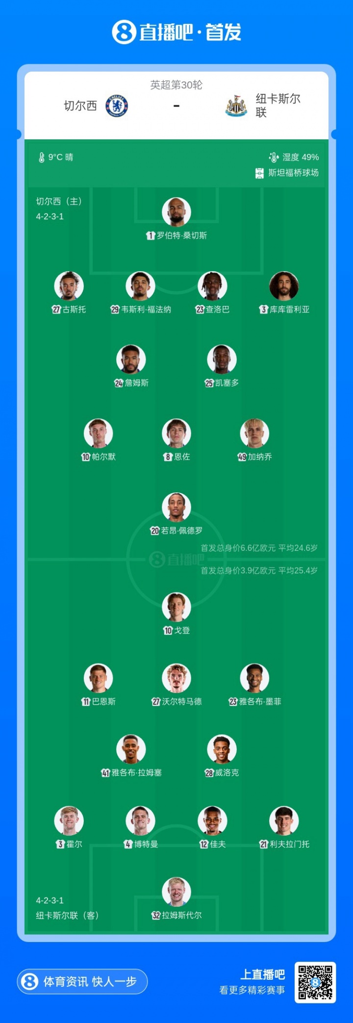 切尔西vs纽卡首发:桑切斯回首发,佩德罗、加纳乔、帕尔默出战